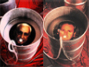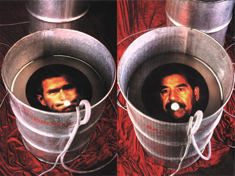 Political leaders and dictators lie in liquid-filled oil drums, gasping for breath. Air bubbles stream from their mouths, as they seem to be drowning.