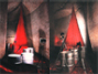 The oil drums stand on humanism’s bright red carpet, draping down from the ceiling in soft, ‘humane’, ethical and aesthetic folds hiding other oil drums containing ‘Past Sinners’.