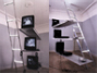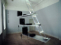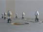 The exhibition presents 5 installations which involve the spectators both physically and mentally, thus making them a part of these three-dimensional works. In one of them, Grey-Eye-Zone, 12 mechanical eyes search the room. Like floodlight projectors they lighten up in all directions, while slowly revolving on their axis. Eyes staring at us, but at the same time binding us if we try to look into them. A horror vision of a future robot-like man ?