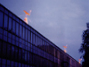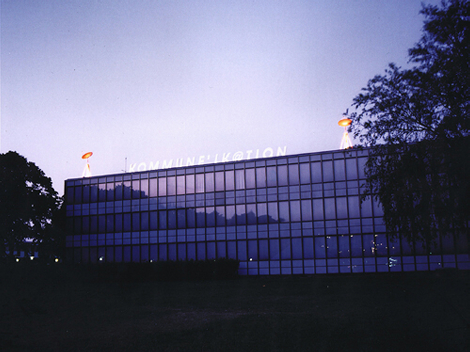 Atop Rødovre Town Hall – a handsome, white, light, reflective 90-meter building by architect Arne Jacobsen – mirror glass letters one meter high spelled out KOMMUNE’ IK@TION, interacting with four neon-red radar/satellite sculptures in constant motion.