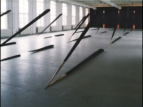 Twelve black burned wooden sculptures, dangling like lifeless bodies from metallic umbilical cords, are suspended among sculpture fragments, resting only on their bronze points.